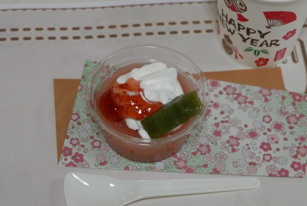 水羊羹とイチゴジャムが紅、ホイップクリームが白でお祝いカラーの紅白になっています✨✨
